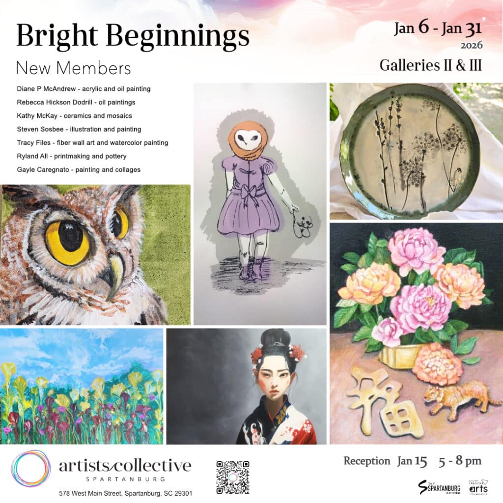 Seven new 2025 members of the Artists Collective | Spartanburg will show their works Jan. 6 through 31 in “Bright Beginnings: Celebrating Our Newest Members of The Collective,” an exhibit in the Collective’s Galleries II and III.