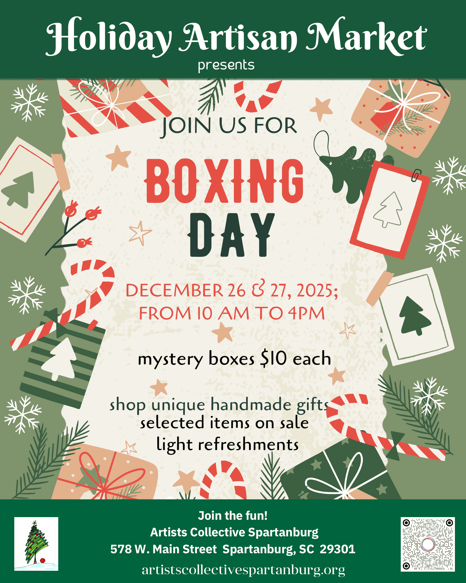 Saturday, Dec 26 & 27 | 10am – 4pm | Free Admission The Artists Collective Spartanburg invites you to shop unique hand-made gifts. Plus just for Boxing Day, our mystery boxes are available for $10...