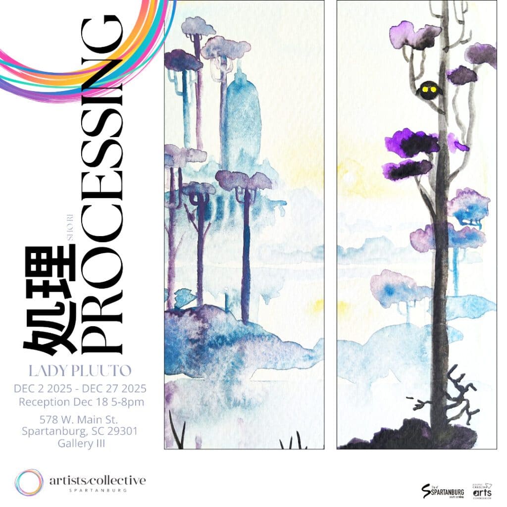 Spartanburg artist Lady Pluuto will exhibit her latest watercolors in a new exhibition, “処理: Processing,” Dec. 2 through 27 in Gallery III of the Artists Collective | Spartanburg. An artist’s reception will be held from...