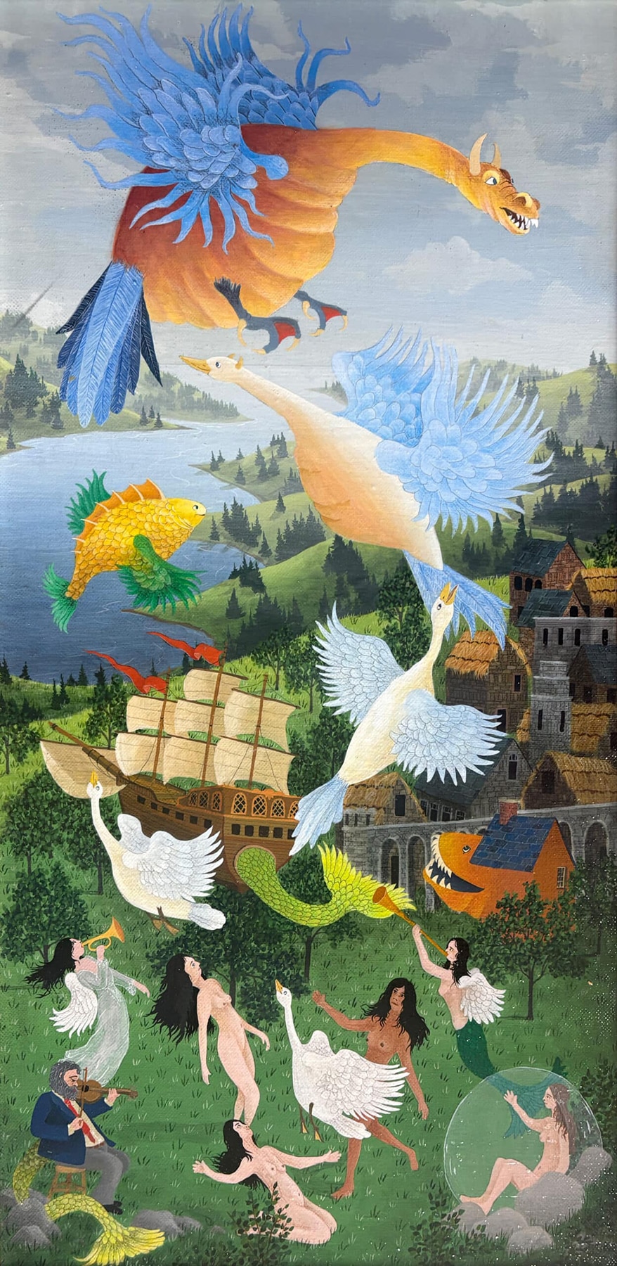 Emily Crow Neeley wrote of Logrippo’s art in an article in Spartanburg Magazine: “Monsters, dragons, whales and fantastical city – and village-scapes often find their way into LoGrippo’s creations. Other paintings show an America that many are nostalgic for: quaint, rural, small-town American life. Inspired by the Old Masters and genre paintings of 16th-century northern Europe, Logrippo takes his cue from the works of two Flemish artists in particular: Hieronymous Bosch’s haunting images of hell and sin, and Pieter Bruegel’s depictions of peasant life – at first glance idyllic, but upon closer inspection, a bit troublesome as well. Logrippo cites these painters as major influences, but art scholars often describe his work as ‘American naïve,’ or in the ‘American Crafts style’ – reminiscent of American folk artists like Grandma Moses.”